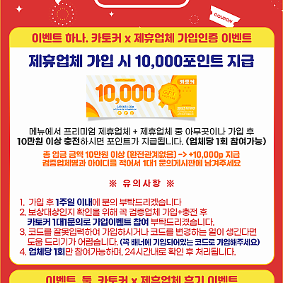 ❤️이벤트 하나, 카토커X제휴업체 가입인증 이벤트제휴업체 가입 시 10,000포인트 지급메뉴에서 프리미엄 제휴업체 + 제휴업체 중 아무곳이나 가입 후10만원 이상 충전하시면 포인…