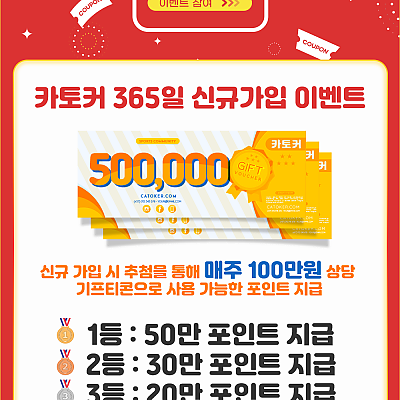 ❤️카토커 365일 신규가입 이벤트신규 가입 시 추첨을 통해매주 100만원상당기프티콘으로 사용 가능한 포인트 지급1등 50만 포인트 지급2등 30만 포인트 지급3등 20만 포인트…