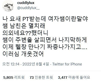 헬스장 PT 여쌤의 남친은 의외로 멸치.jpg 타짜이진호 0 28 0 0 10.12 15:09 ㅋㅋㅋㅋㅋㅋㅋㅋㅋㅋ 0 0 Author 0 0 Lv.28 타짜이진호 아이언 279,900 (36.1%) 등록된 서명이 없습니다.