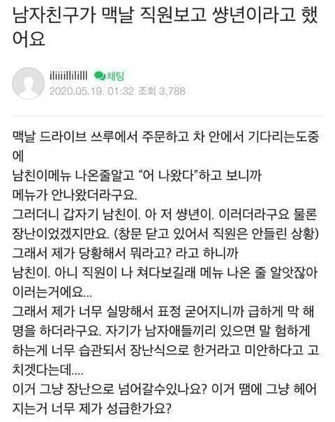 남자친구가 맥날 직원보고 쌍년이라 함 짜라빠빠 1 53 0 0 10.07 21:02 가오충 아웃 0 0 Author 0 0 Lv.24 짜라빠빠 아이언 202,590 (14.5%) 등록된 서명이 없습니다.