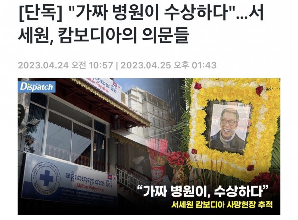 디스패치가 취재한 캄보디아에서 서세원의 죽음 휘낭시에 1 113 1 0 10.14 20:20 https://link.fmkorea.org/link.php?url=https%3A%2F%2Fwww.dispatch.co.kr%2F2247108&lnu=4234851326&mykey=MDAwNjIxMzAzNTExMg== 1 0 Author 0 0 Lv.12 휘낭시에 아이언 56,130 (76.2%) 등록된 서명이 없습니다.