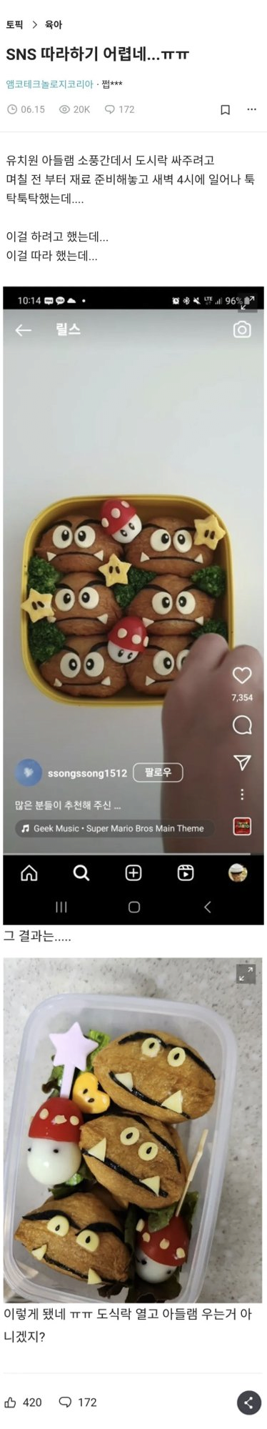 SNS 보고 따라 만든 도시락 대참사. 후지산 1 120 0 0 09.30 10:26 ㅋㅋㅋㅋ졸귀 0 0 Author 0 0 Lv.25 후지산 아이언 234,490 (97.1%) 등록된 서명이 없습니다.