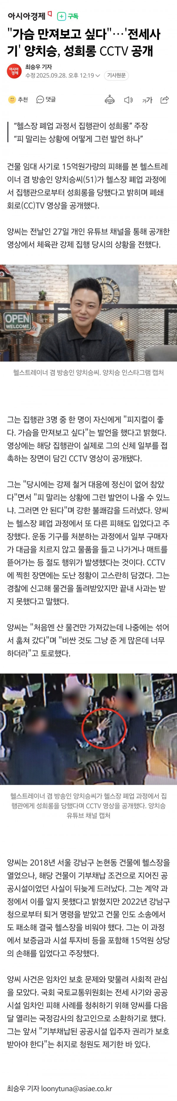 "가슴 만져보고 싶다"…'전세사기' 양치승, 성희롱 CCTV 공개 뽀미 2 292 2 0 09.28 17:04 2 0 Author 0 0 Lv.27 뽀미 아이언 256,820 (17.2%) 등록된 서명이 없습니다.