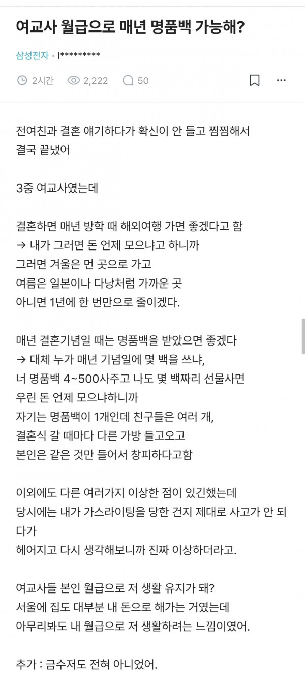 1년마다 명품백 요구하는 여교사랑 결혼 파토 검색 1 119 1 0 10.13 13:57 1 0 Author 0 0 Lv.28 검색 아이언 274,320 (8.1%) 등록된 서명이 없습니다.